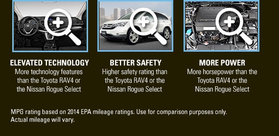 Compared to the 2014 Toyota RAV4 and 2014 Nissan Rogue Select, the 2014 Honda CR-V offers more power, comparable or better fuel economy and a 5-Star safety rating from SaferCar.gov.